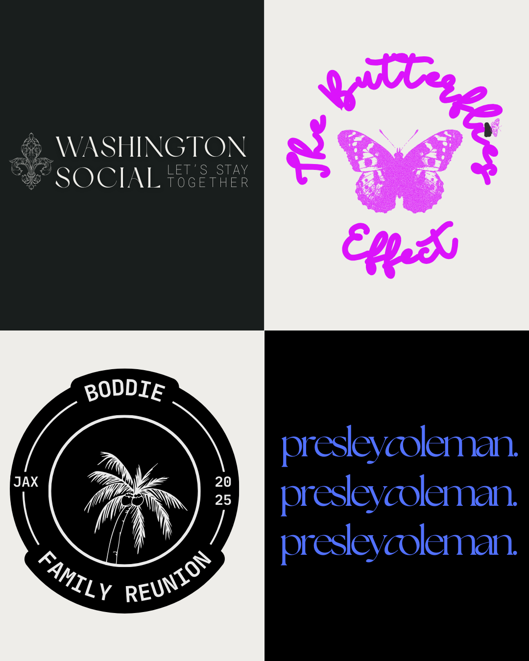 Designs logo concepts that explore form and typography across a range of brand styles. Each logo is developed as part of a full brand kit, ensuring consistency across applications and touchpoints.